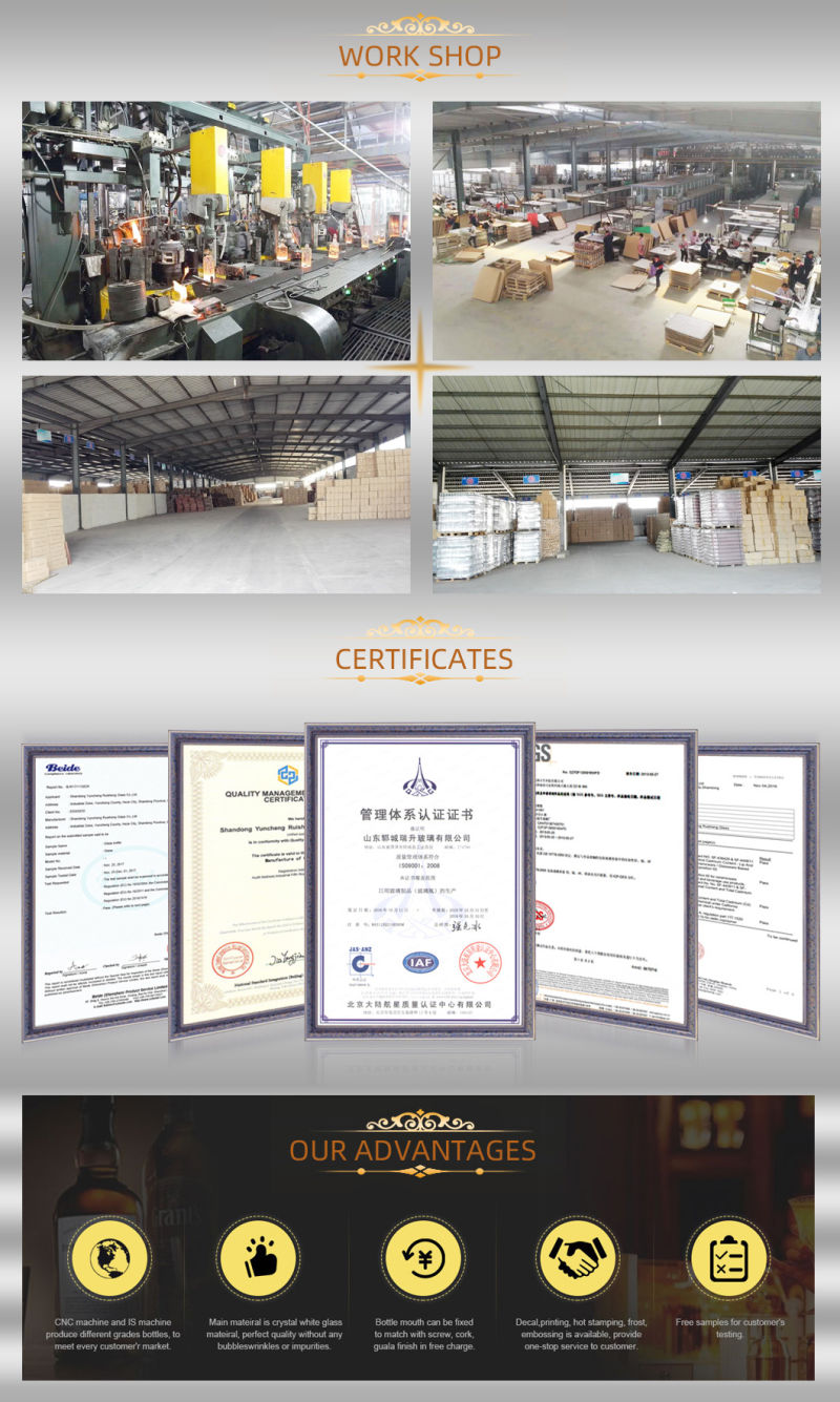 Shandong Yuncheng Ruisheng Glass Co., Ltd. ist in Yuncheng Shandong, China. With die Geschä Ftsgrundregel „der Qualitä Ts und hohe Definition“, unsere Firma hat mehr als Dollar 5million in 3 Produktionszweigen der h5ochstentwickelten CNC-manuellen Maschinen, 4 Produktionszweige der CNC-halbautomatischen Maschinen investiert. Cnc-Maschinen werden verwendet, um erstklassige Glasflaschen, weiß E/Superfeuersteinglaskristallflaschen zu produzieren, mit vollkommener Qualitä T, hohem Transparent und glatter Oberflä Che. Die Ausgabe ist 120, 000pcs pro Tag. Wenn Sie mittlere Gradflaschen ja wü Nschen kö Nnen wir sie auch tun, mit vollautomatischem 2sets SIND Maschinen fü R hohe weiß E Glasflaschen, die Tagesleistung sind 200, 000pcs. Mit 500 Angestellten und einer Gruppe erfahrenen Ingenieuren mit reicher Erfahrung, haben wir ein gutes Renommee auf der ganzen Erde.